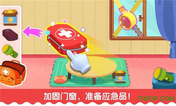 在家庭场景中,游戏教导孩子们如何做好室内防台风准备。小朋友需要将阳台上的衣物、花盆等容易被风吹走的物品收进屋内,避免高空坠物危险。接着要检查门窗是否锁紧,并在玻璃上贴成"米"字形的胶带,增强玻璃的抗风能力。游戏还特别设置了应急包准备环节,孩子们需要按照清单准备毛毯、干粮、手电筒、电池、毛巾和急救包等应急物资,学习应对台风可能造成的停水停电等突发状况。
