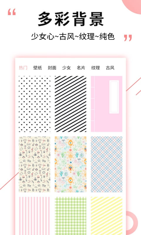 超多丰富背景任意组合,二次元背景,小清新背景,多种纹理背景,纯色背景……一种背景代表了一种心情,自己原创的图文,就是这么有内涵。背景库持续更新,紧跟设计潮流趋势,让您的作品始终保持新鲜感。