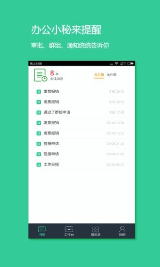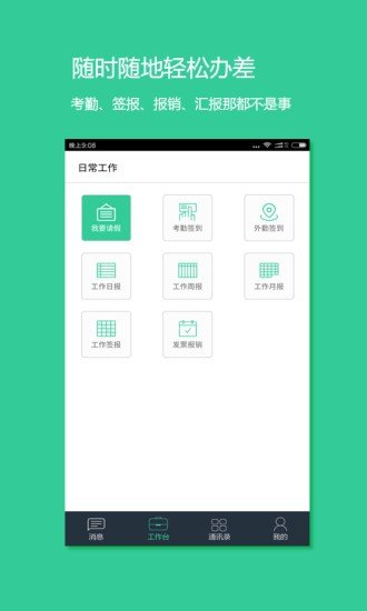 包含消息中心、通讯录、工作流等移动办公功能,随时随地享受移动办公的乐趣。帮你完成一切。