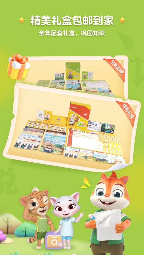全年配套精美礼盒,帮助孩子巩固知识;每季度寄送与课程配套的实体绘本、识字卡和益智玩具,实现线上线下学习无缝衔接。