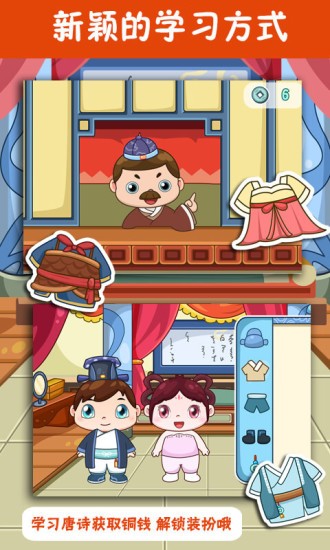 创新的学习方式是本游戏的一大特色。游戏将唐诗学习与换装游戏巧妙结合,通过收集卷轴、兑换金币、购买服饰等环节,让学习过程充满乐趣。唐诗以古色古香的卷轴形式呈现,孩子们可以一边展开卷轴,一边逐句朗读记忆。这种新颖的互动方式大大提升了学习的趣味性和有效性。