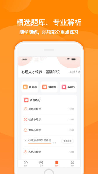 可在线刷题,还有名师在线授课,是由愈见幸福开发的移动在线学习平台;平台将传统心理学教育与现代科技完美结合,打造出高效便捷的学习体验。智能刷题系统能精准定位知识薄弱点,名师直播课程让学习更加生动有趣。