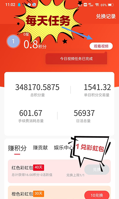 到任务中心兑换领取红色彩虹包,每日登录还可领取额外积分奖励