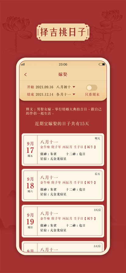 特别多的生肖运势,你都能够从软件查询,让你拥有趣味的解读方式。涵盖十二生肖的年度、月度运程分析,并附带开运小贴士和相生相克关系图解。可以提供天气情况让你了解更多,天气变化,及时的添加衣物。接入权威气象数据,支持未来15天天气预报和空气质量指数查询,附带穿衣指数提醒。能够进行日程的规划,并且还能够了解到下一个节日倒计时的时间。智能提醒功能可设置重要日程,自动计算距离传统节日和法定假日的剩余天数。能为你提供更加齐全的日历资料,还能够当做你的备忘录使用。支持多端云同步,可记录生日、纪念日等重要日期,并设置周期性提醒。