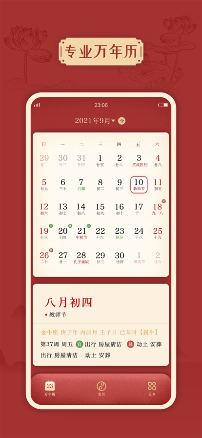 能够精准的提供农历公历,还能够了解更多的相关信息,就连黄历也可以让你轻松的查询,并且了解到当天适宜干的事情,不适宜做的事情,能够显示当天的运势,便于自己做好决定,并且还能够推算出幸运指数。软件界面设计简洁大方,操作流畅,数据更新及时准确,既保留了传统历法的精髓,又融入了现代人需要的实用功能,是日常生活和传统文化爱好者的必备工具。