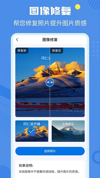 支持老照片修复、修复旧照、图片修复还原、黑白上色类图片修复上色、图片还原功能。无论是褪色、折痕还是污渍,都能通过智能算法完美修复,让珍贵影像重获新生。