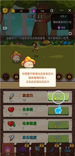 磨叽蘑菇是一款融合了RPG元素的横版冒险手游,玩家通过简单的搜索即可开启这段奇妙的蘑菇王国之旅。游戏采用经典的左右移动操作方式,配合跳跃、攻击等基础动作,带来极易上手却富有策略性的战斗体验。在冒险过程中,玩家不仅要应对层出不穷的小怪袭击,还要收集金币强化角色属性,最终挑战各具特色的关卡BOSS。特别设计的角色成长系统让每次升级都充满成就感,而隐藏彩蛋和支线任务更大大提升了游戏的可探索性。