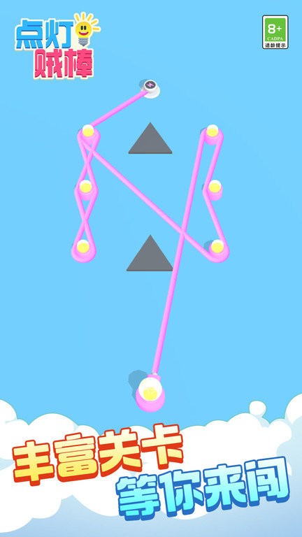 《点灯贼棒》是一款风靡全球的连线解谜游戏,最新版本带来了更多创新内容和优化体验。游戏核心玩法简单易懂却充满深度:玩家需要通过绘制线路,让所有灯泡都通上电。每个关卡都经过精心设计,从基础教学到复杂谜题循序渐进。游戏支持随时存档,方便玩家利用碎片时间挑战。独特的物理引擎让连线过程更加真实自然,灯泡点亮的瞬间还会绽放绚丽的光效,带来满满的成就感。
