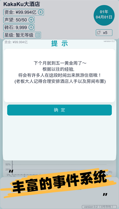 游戏赋予玩家极高的自由度,你可以随心所欲地设计酒店风格,从建筑外观到室内装潢,从服务项目到价格策略,完全按照自己的经营理念来打造独一无二的酒店。游戏特别设计了丰富的事件系统,除了日常经营外,你还需要应对各种大型活动,如政要会议、商业论坛、明星派对等,这些活动不仅能带来丰厚收益,更能显著提升酒店声誉。最特别的是,游戏还加入了家族经营元素,你可以建立自己的酒店世家,见证家族事业的代代传承。