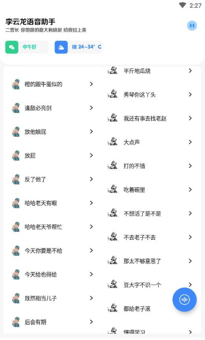 李云龙助手是一款集娱乐性与功能性于一体的语音包软件,它以影视角色李云龙的经典台词为核心,为用户带来无限欢乐。软件内置智能悬浮窗功能,操作简单便捷,只需轻轻一点即可快速切换和播放各类语音内容。无论是游戏开黑时的激情互动,还是日常聊天中的幽默调剂,这款软件都能让你的语音表达更加生动有趣。此外,软件还支持自定义设置,用户可以根据个人喜好调整播放效果,打造专属的语音体验。
