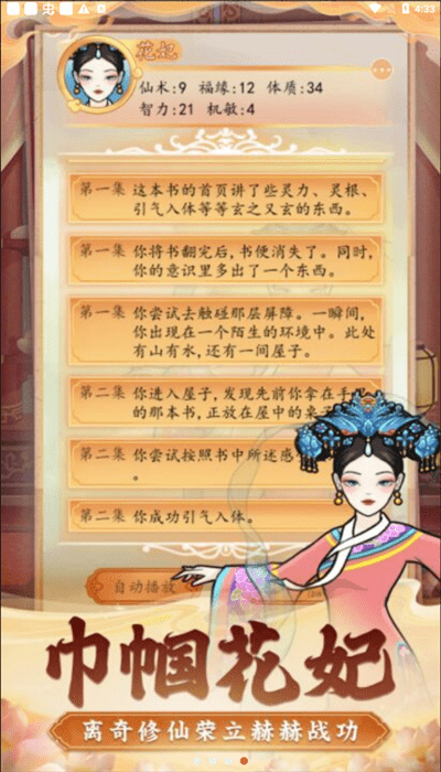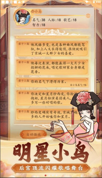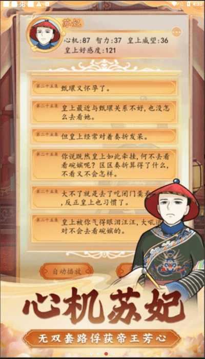 皇宫人生模拟器是一款极具沉浸感的宫廷模拟游戏,玩家将穿越时空成为九五之尊。在这个精心打造的虚拟王朝中,您不仅能体验批阅奏折、处理朝政的帝王日常,还能感受后宫佳丽三千的浪漫情调。游戏通过细腻的场景设计和丰富的剧情分支,让您真实感受权力巅峰的荣耀与责任。从微服私访到御驾亲征,每一次抉择都将影响王朝命运,带您领略最真实的古代帝王人生。