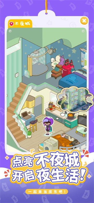 经营公寓,开个小卖铺,做个良心房东!在游戏中您不仅可以收取房租,还能经营便利店、菜鸟驿站等配套设施,全方位满足租客需求。安排租客生活,你就是最美房东!通过合理安排租客的起居作息,提升他们的满意度,让公寓充满温馨氛围。结识各种各样的租客,觉得社会畜生活太累?那就给减减租!遇到加班到深夜的程序员,不妨给予特殊关怀。觉得程序猿太孤单?升级个超级大圆床给他体验一下!贴心的家具配置能让租客感受到家的温暖。生活日用全部五折,改善租客生活。定期举办促销活动,让租客享受到实实在在的优惠。菜鸡驿站必须配套,解决租客收发快递难题,生活配套一应俱全!完善的社区服务能让您的公寓更具竞争力。