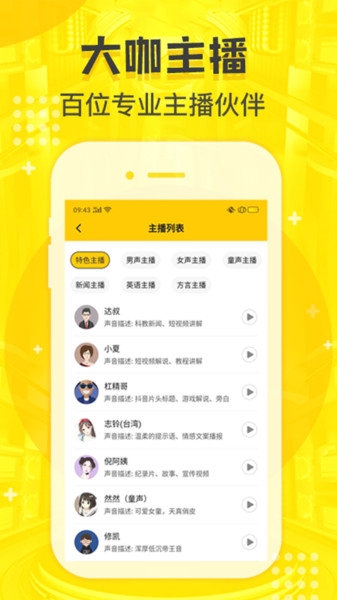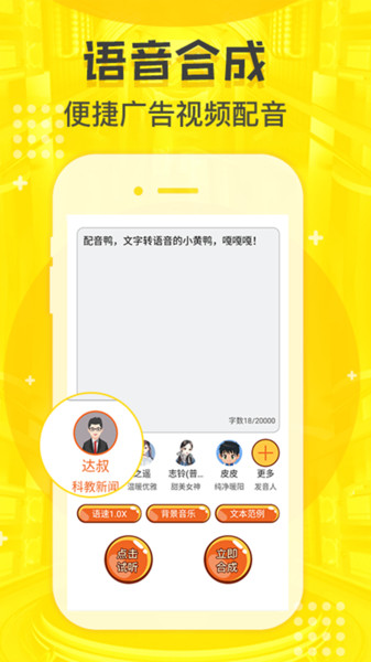 配音鸭app是一款集专业性与趣味性于一体的智能配音软件。它拥有强大的语音合成引擎,提供近600位风格各异的智能主播,涵盖男女声、童声、方言及多国外语发音,还能模拟抖音热门音效。用户可自由编辑文本内容,精准调节语速、停顿和情感表达,并搭配丰富的背景音乐库,轻松打造个性化配音作品。无论是短视频创作、商业广告还是个人娱乐,这款工具都能满足不同场景的配音需求,让声音创作变得简单高效。