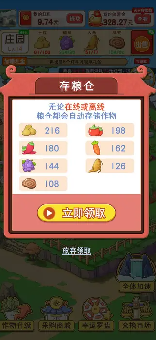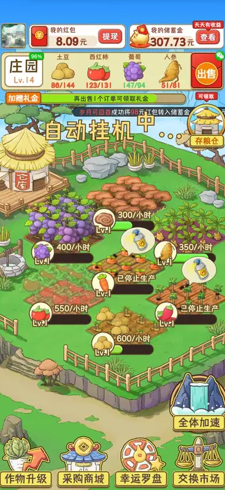 玩转集市,轻松赚钱,在如画风景里经营你梦想中的农家庄园!轻松休闲的放置经营类种田游戏,但却在传统种田游戏中加入了与众不同的集市贸易系统。在这里,你可以种田养鸡,收藏稀有的奇珍异宝,用好酒广招八方来客。你亲手收获的农作物可以做成美味佳肴,更能在集市中择机出售赚取红包。快用你的智慧洞察市价波动,自己掌控红包收益,成为富甲一方的庄园主吧~集市价格会随时间波动,掌握买卖时机是获得更多红包的关键。