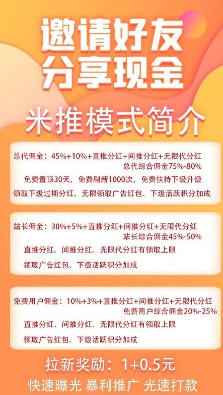 总代佣金:45%+10%+直推分红+间推分红+无限代分红 总代综合佣金75%-80% 免费置顶30天,免费刷新1000次,免费扶持下级升级 领取下级过期分红、无限领取红包、下级活跃积分加成 站长佣金:30%+5%+直推分红+间推分红+无限代分红 站长综合佣金45%-50% 直推分红、间推分红、无限代分红有领取上限 领取广告红包、下级活跃积分加成 免费用户佣金:10%+3%+直推分红+间推分红+无限代分红 免费用户综合佣金20%-25% 直推分红、间推分红、无限代分红有领取上限 领取广告红包、下级活跃积分加成