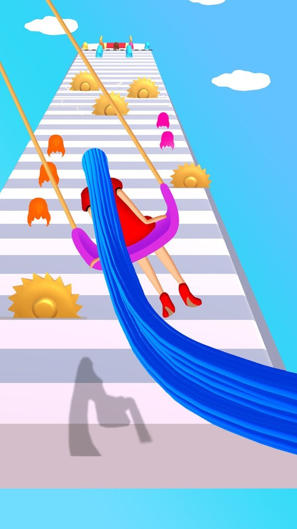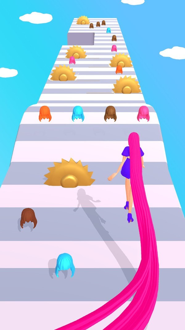 游戏最大的特色在于独特的头发机制设计。在奔跑过程中,你需要时刻注意保护自己的长发,因为遇到某些特定颜色的障碍物会损伤你的头发。游戏还设置了剪刀道具,每次点击都会剪短你的头发,这将直接影响你的通关表现。此外,游戏对玩家的反应速度和操作技巧提出了较高要求,你需要快速做出判断,灵活操控角色躲避各种突如其来的危险。