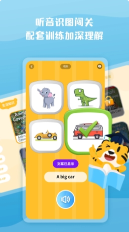 这款软件中的学习资源是特别丰富的,还有多种的学习方式,根据小朋友的年龄选择优质的学习方式,轻松教会孩子学习英语,还有各种听音识图闯关等内容,让孩子学习中更有成就感。专业的课程体系配合趣味互动,既保证了学习效果,又让孩子享受学习过程,是家长放心的英语启蒙好帮手。