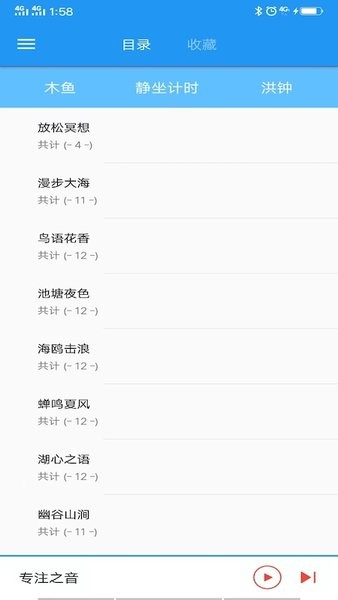 木鱼蝉曲免费版拥有精心设计的音效库,包含木鱼声、钟声等传统乐器音效,以及静坐计时功能。特别值得一提的是,应用内置了多种自然场景的背景音乐:如让人身心放松的冥想音乐、仿佛置身海边的漫步大海、充满生机的鸟语花香、宁静祥和的池塘夜色、气势磅礴的海鸥击浪、热闹非凡的蝉蛙争鸣、静谧悠远的湖心之语以及空灵幽静的幽谷山涧。这些音效都经过专业调音师精心制作,确保带给用户最真实自然的听觉体验。