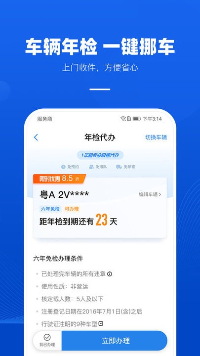 【车辆年检】与邮政系统深度合作,提供上门取送车服务,年检流程在线办理,到期自动提醒