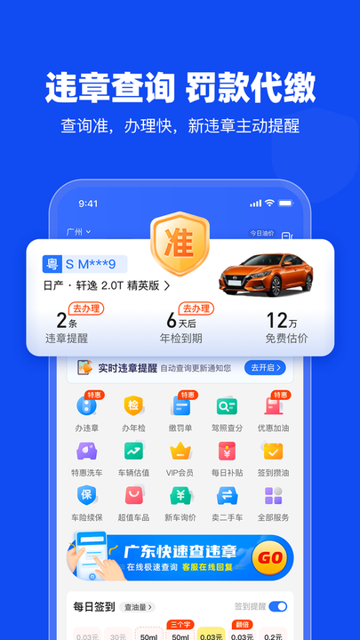 提供全面的车主信息服务,包括汽车保养知识、用车技巧、二手车行情、车险比价、贷款方案等专业内容。所有数据云端同步,换手机也不怕信息丢失。违章提醒功能全国通用,油卡充值享受88折优惠即时到账。年检服务与邮政合作,足不出户完成年检。VIP用户更享全年违章代办免服务费特权,真正实现一站式车务管理。
