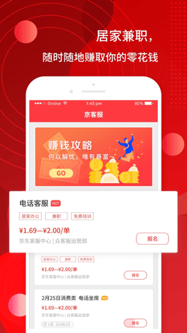 京客服兼职平台是一款专为灵活就业人群打造的优质兼职服务平台,致力于为用户提供丰富多样的兼职机会。无论你是学生、宝妈、自由职业者,还是希望利用业余时间增加收入的上班族,都能在这里找到适合自己的工作。平台涵盖服务业、销售、自媒体等多个热门领域,提供海量电话兼职信息,让你轻松了解行业动态和薪资待遇。通过智能匹配系统,平台会根据你的兴趣、技能和时间安排,为你推荐最适合的兼职任务,帮助你在工作与生活之间找到完美平衡。