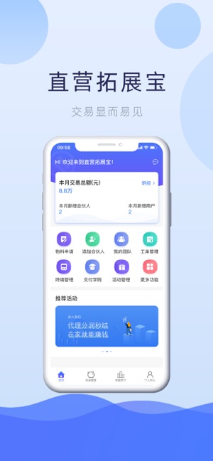 直营拓展宝为收单机构及合伙人提供了极其高效的运营管理平台。简洁直观的界面设计配合流畅的操作流程,让用户能够快速上手并高效完成各项业务操作,大幅提升工作效率。
