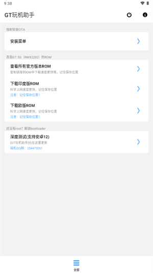首先需要在本站下载并安装GT玩机助手软件,安装完成后打开应用,系统会提示授予必要的使用权限。进入主界面后,选择"强制安装OTA"功能选项,软件会自动检测可用的系统版本。用户可以根据自己的需求选择合适的系统版本进行下载,下载完成后点击安装按钮即可完成系统更新。整个过程简单明了,软件会提供详细的操作指引,确保用户能够顺利完成每一步操作。