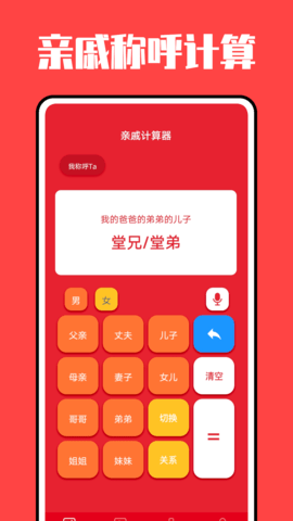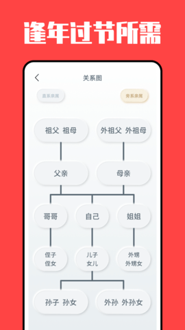 用软件拒绝叫不出口的尴尬,搞定亲戚称谓。特别添加了方言称呼选项,满足不同地区的称呼习惯。