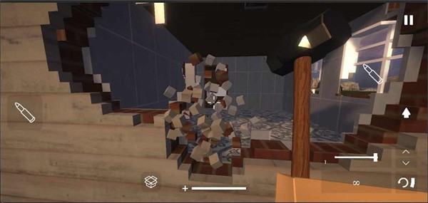 游戏包含12种建筑类型,从木质农舍到钢筋大厦各有特色。厨房场景的燃气管道、卫生间的瓷砖墙面都设有特殊破坏机制。初始锤子可升级为带电击效果的雷霆之锤,后期解锁的冲锋枪能扫射玻璃幕墙。定时炸弹适合拆除承重柱,而新加入的磁力装置能瞬间吸垮整个钢结构。装备强化系统包含26种属性提升,比如扩大爆破范围或延长慢镜头持续时间。
