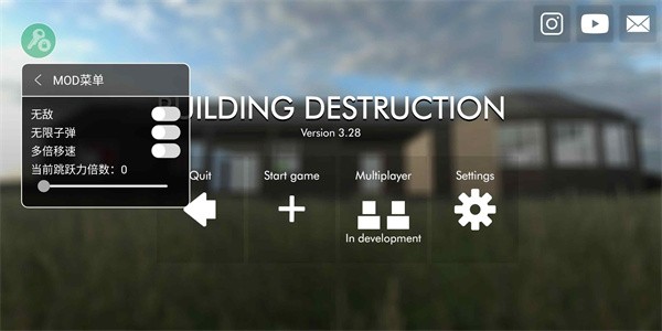 无敌模式让你无视坍塌伤害,在钢筋水泥中自由穿梭。无限子弹功能解除弹药限制,可连续发射火箭弹轰击建筑承重墙。多倍移速赋予角色超人般的行动能力,轻松闪避坠落物。独创的五段跳跃力调节系统,既能实现精准的二楼破拆,也能完成夸张的飞跃屋顶表演。这些功能通过悬浮菜单随时开关,满足不同阶段的游戏需求。