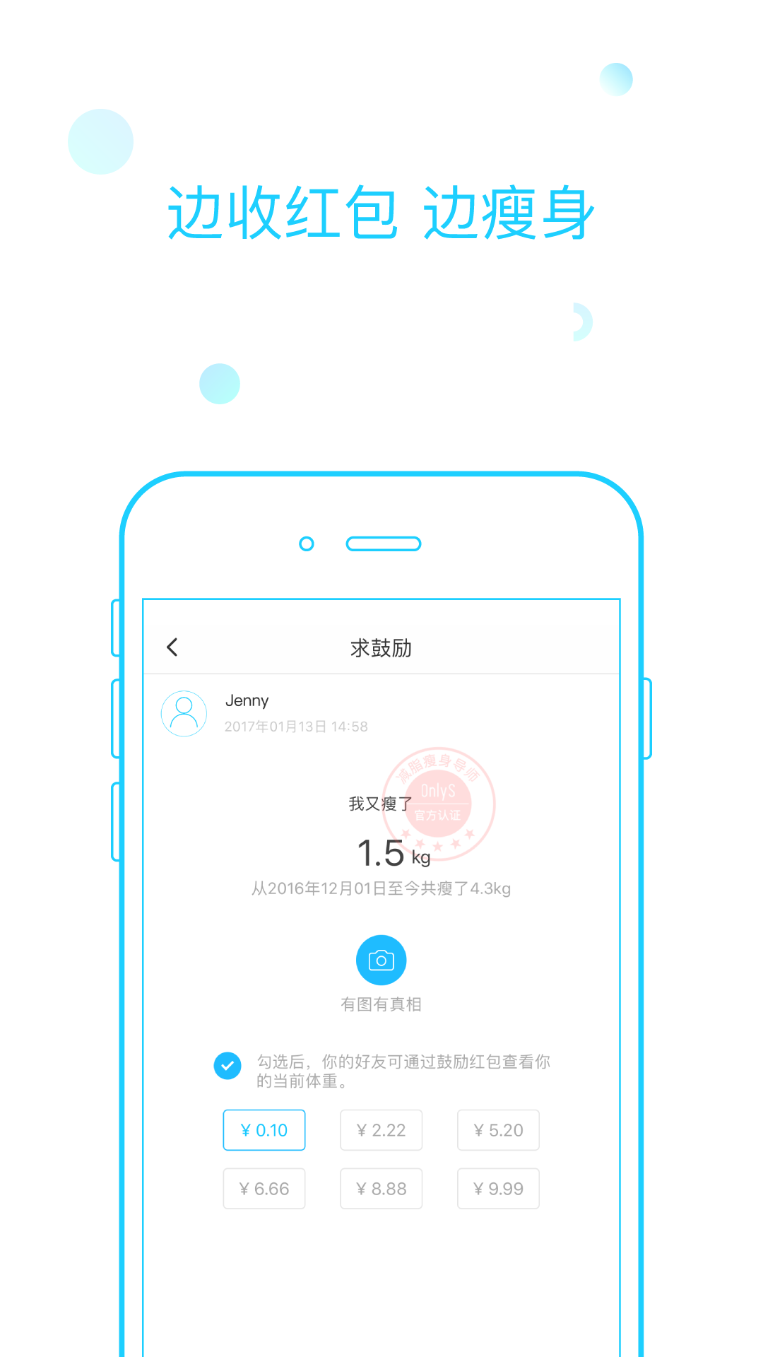 【OnlyS】一个让你能感受到身边朋友温暖和鼓励的应用;应用内置社交功能,把你的目标,你的减脂成绩告诉你身边的好友,大家的鼓励红包、点赞支持将源源不断,而这些都将记录在的OnlyS里面,看到他们的鼓励,你一定会信心百倍。我们还定期举办减脂挑战赛,让减脂变成一场有趣的社交活动。