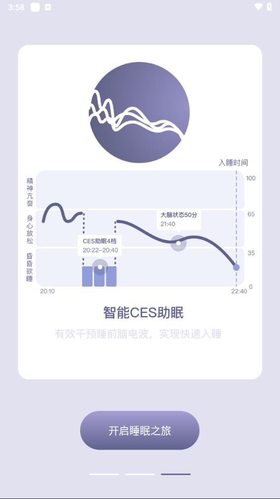 -助眠模式:提供多种场景化助眠方案,用户可根据个人偏好选择不同时长的CES微电理疗,配合精心设计的自然音效或白噪音,营造最佳入睡环境。系统还会根据使用记录智能调整方案,持续优化助眠效果。