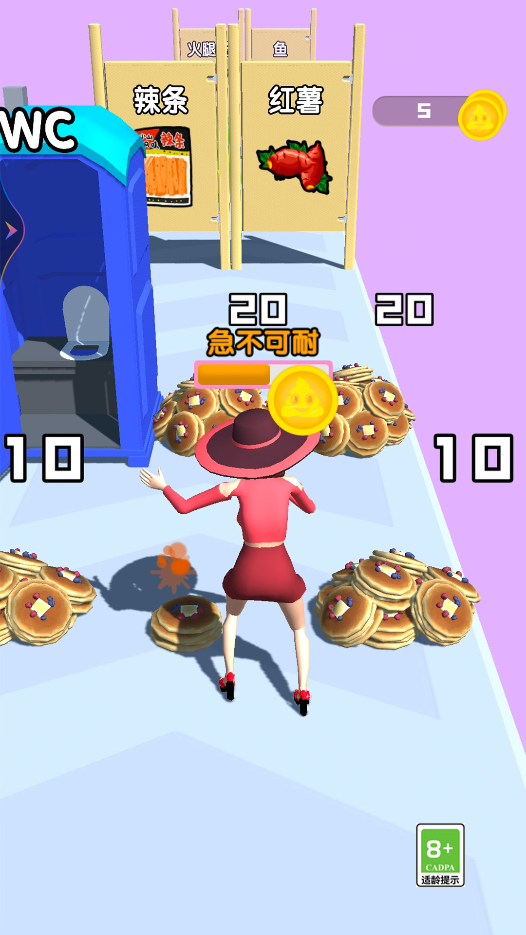《快去上厕所》是一款轻松休闲的跑酷游戏,非常适合用来锻炼玩家的反应能力和决策能力。游戏采用双道路设计,玩家需要在两条不同的路径之间做出选择。每条路径上都会出现不同的道具和障碍,有些会增加主角的便意,有些则会减少肚子容量。玩家的目标是在有限的时间内精准计算分数,尽量让主角卡在即将爆发的临界点,从而获得更高的分数。这种独特的玩法既考验玩家的策略思维,又增添了游戏的趣味性。