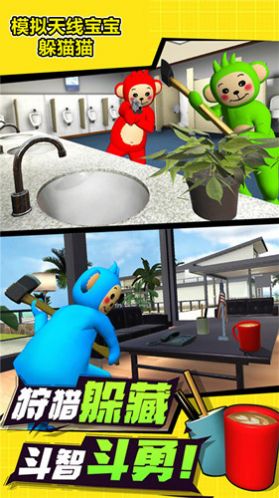 模拟天线宝宝躲猫猫游戏画面可爱卡通,萌呆的天线宝宝与可爱的猫猫形成强烈对比,让玩家爱不释手。