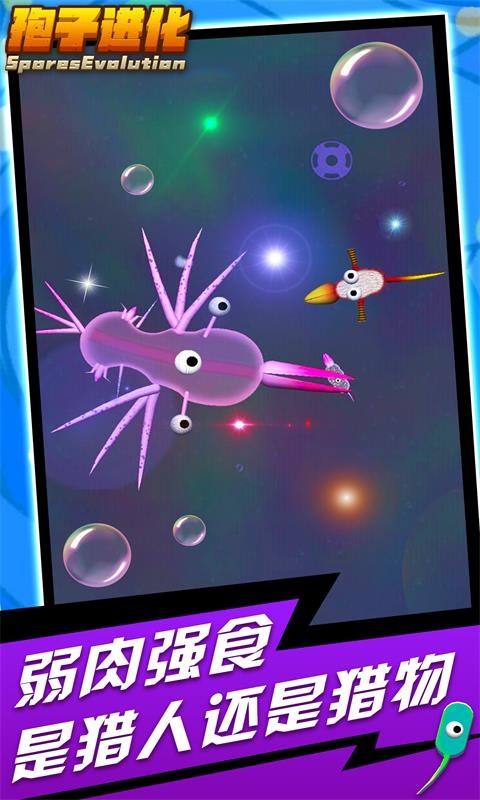 感受生物演变的全新经历,不断吞噬新的生物让自己更加强大,体验不断蜕变的过程。游戏完整呈现了从单细胞到复杂生物的进化链。