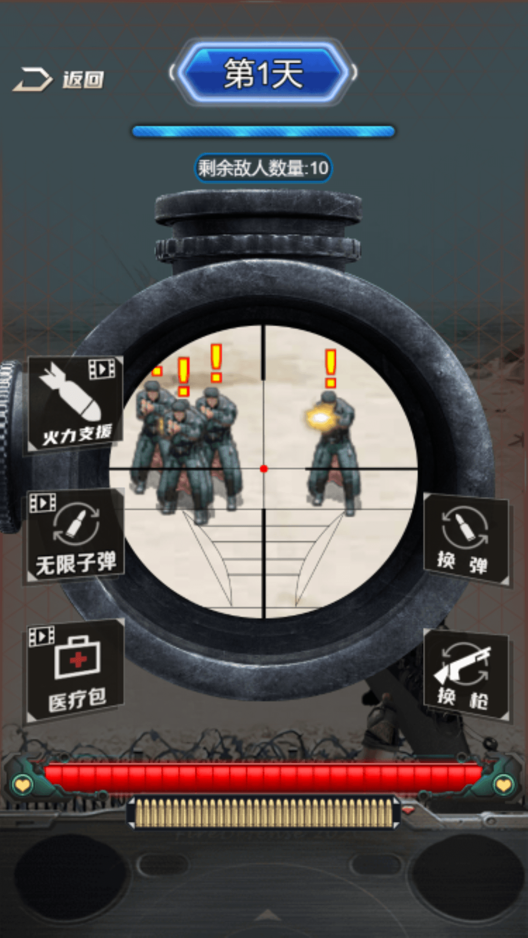 令人震惊的枪战场面。每个士兵都穿着整齐,在热血枪战之中运用你的技能,注意弹药管理和换弹时机