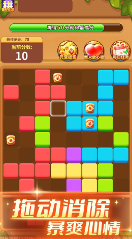 通过高分获得的红包奖励,为玩家提供了一种赚钱的方式,增加了游戏的吸引力。游戏采用直观的触控操作,只需单指拖拽就能完成所有动作,操作门槛极低。游戏玩法简单易懂,操作轻松流畅,非常适合休闲碎片时间的娱乐。设有多个关卡和挑战,形状各异的方块让你不断面对新的消除难题。贴心的新手教程会逐步引导玩家掌握游戏技巧,即使是初次接触此类游戏的玩家也能快速上手。开发者将定期更新游戏内容,增加新的关卡、道具等,保持游戏的新鲜感和乐趣。游戏还支持离线游玩,随时随地都能享受消除的快乐。
