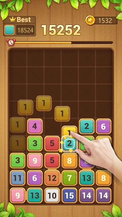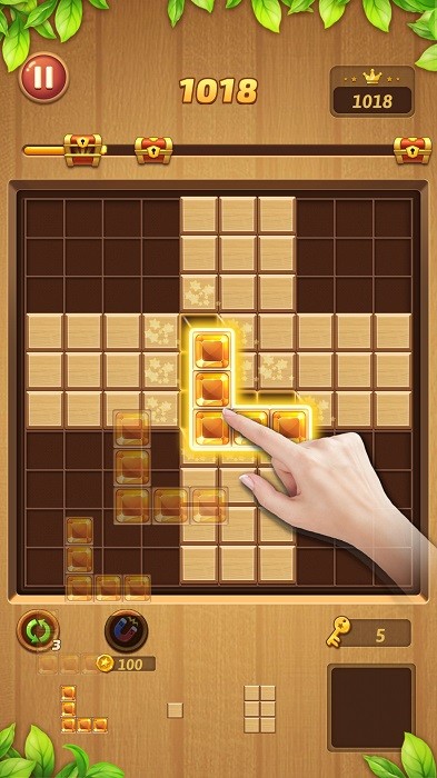木块拼图:经典拼图玩法升级版,将各种形状的木块放入10*10的网格中,通过横向纵向的巧妙排列完成消除,考验空间想象力。