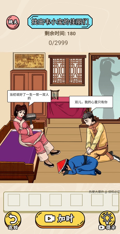 相信自己一定能成为智慧与美貌相结合的脑力界达人。游戏不仅能带来欢乐,更能提升玩家的观察力和思维能力。每一道关卡都经过精心策划,不仅仅是外表上能看出答案的。很多谜题需要玩家深入思考才能发现隐藏的线索。这里将会有更多能锻炼您思考能力的关卡设计,更多高难度的挑战等待您去完成。游戏团队持续更新内容,确保玩家能持续获得新的挑战。多种玩法将在游戏中自由展开,有时千万不要局限于图片上的答案。有些关卡需要结合网络热梗知识才能顺利通关。
