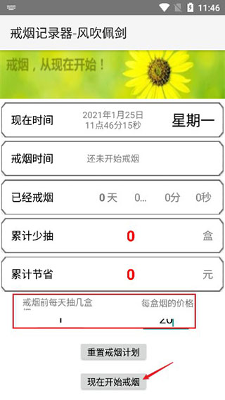 首先输入戒烟前每天抽几盒,以及每盒烟的价钱,点击现在开始;系统会根据这些基础数据自动建立个性化的戒烟计划,为后续的进度追踪提供参考基准。