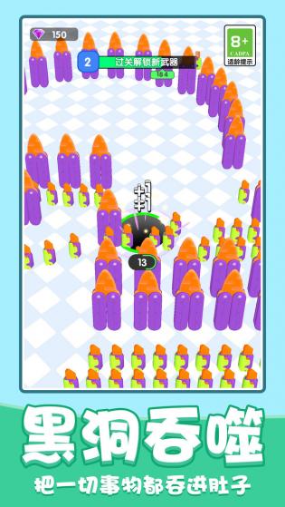 精美的3D建模风格呈现,沉浸在逼真的游戏世界中。光影效果和粒子特效都经过精心设计,打造出震撼的视觉体验。操作简单。玩家只需轻松控制黑洞吞噬胡萝卜刀,即可享受简单但富有挑战性的游戏体验。直观的触控操作让新手也能快速上手。黑洞具有进化属性和能力。玩家可以通过不断吞食胡萝卜刀来增加黑洞的强度。进化过程会带来明显的视觉变化和实力提升。玩家需要在有限的时间内捡起尽可能多的胡萝卜刀,挑战自己的反应速度和眼力。时间限制增加了游戏的紧张感和刺激性。