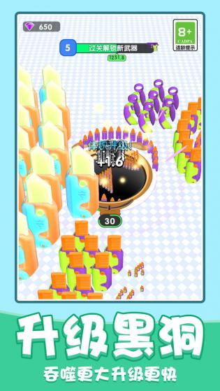 黑洞通过吞噬一切而逐渐成长、膨胀,包括行星、行星、陨石等;从微观粒子到巨大天体,所有物质都能成为黑洞的养分。黑洞随着能量的增加会产生炫酷的爆炸效果,甚至可能导致失控;这些视觉效果不仅华丽,还会影响周围环境。随着不同关卡的进展,玩家可以解锁不同的皮肤,让黑洞看起来更加个性化。从经典黑洞到彩虹漩涡,多样化的外观选择满足不同审美需求。