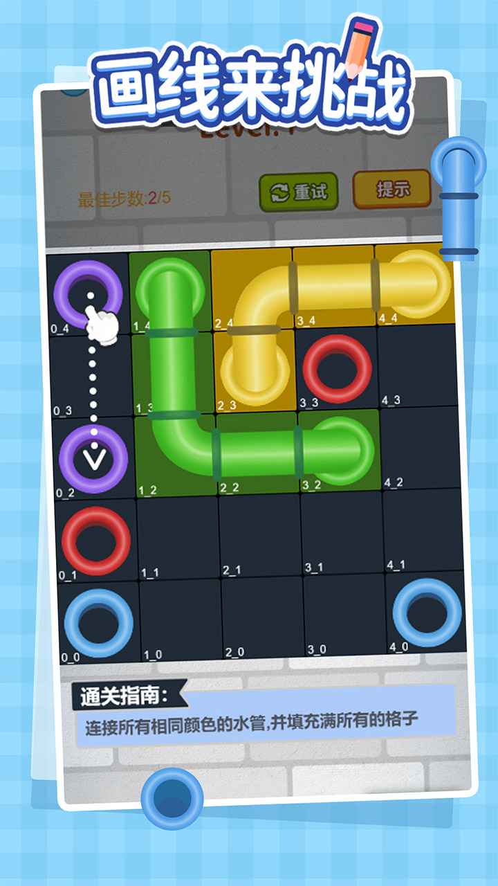 画线来挑战是一款极具创意的益智解谜游戏,玩家需要通过画线的方式将不同颜色的圆圈连接起来,完成各种有趣的关卡挑战。游戏拥有丰富多样的关卡设计,每个关卡都需要玩家运用独特的画线技巧和策略思维,将所有管线完美连接。这不仅考验玩家的观察能力,还需要精准的预判水平,是一款兼具休闲娱乐和脑力激荡的精品游戏。