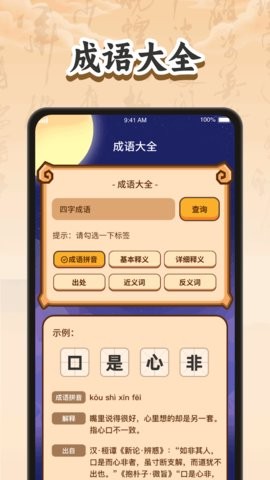 智慧畅答的在线查询功能支持多种检索方式,包括拼音、首字母、释义关键词等,让用户能快速找到所需成语的详细解析。收藏夹功能不仅支持分类管理,还能设置学习提醒,帮助用户建立规律的复习习惯。每个成语都配有生动形象的例句和典故讲解,通过情景化学习加深理解。软件还提供成语使用频率统计和易错点分析,帮助用户精准提升薄弱环节。