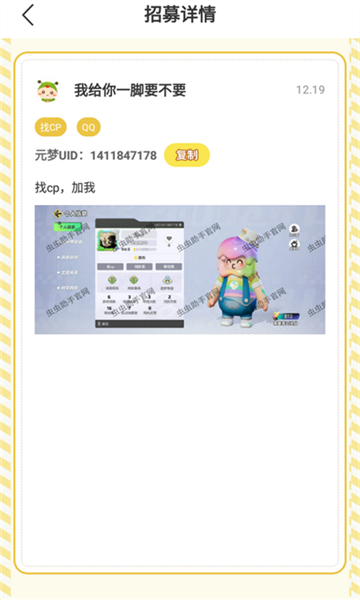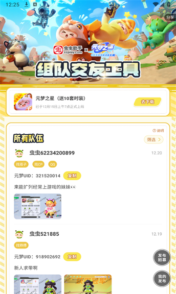 虫虫助手交友工具APP是一个充满活力的游戏社交平台,专为热爱游戏的玩家设计。在这里,你可以轻松组建游戏队伍,找到志同道合的玩伴。平台实时更新各类战队招募信息,让你随时掌握最新动态。无论你是想加入顶级战队提升实力,还是寻找休闲玩家一起娱乐,这里都能满足你的需求。丰富的社交功能让你在游戏之余也能结交新朋友,让游戏体验更加丰富多彩。
