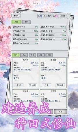 游戏操作简单,纯点击,更多的玩法在一些资源分配,策略经营上,玩家需要不断发展自己的修炼场所,获得更多稀有物资,规划每种资源的生成效率。随着境界提升,还能解锁炼丹、炼器等特色系统,打造专属修仙之路。