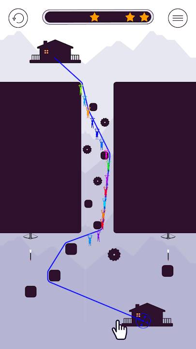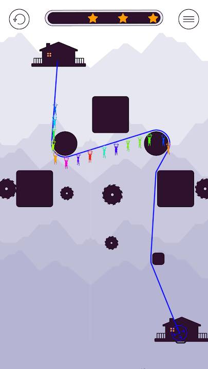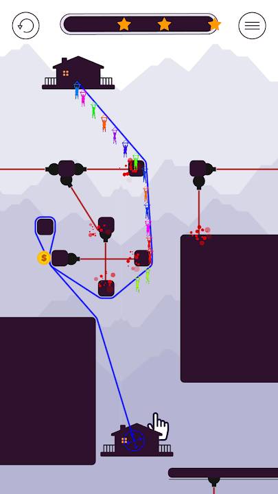 这款物理画线闯关游戏将简单操作与深度策略完美结合。玩家只需用手指在屏幕上滑动,就能创造出连接两座小屋的滑索线路。游戏中的每个场景都暗藏玄机,旋转的齿轮、移动的平台和突然出现的障碍物都会威胁小人安全。随着游戏进程,玩家需要运用物理知识预判线路张力,合理利用弹簧、滑轮等特殊装置。特别设计的关卡编辑器还能让玩家创造专属挑战,与好友分享独特谜题。