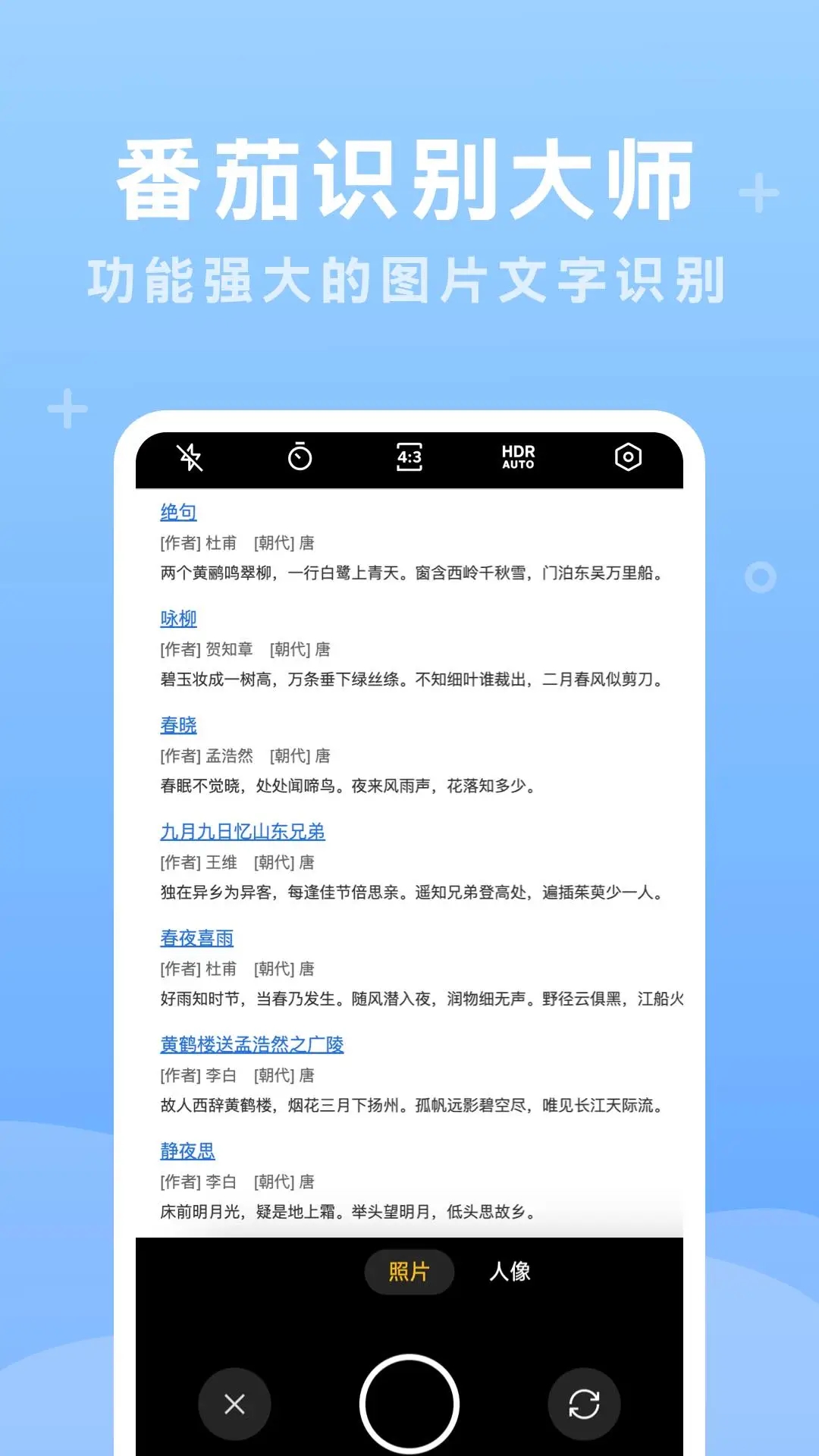 番茄识别大师支持直接从相册导入图片或实时拍照扫描,快速精准地识别图片中的文字内容。该应用采用智能算法优化,能够适应不同光线条件和字体样式,确保在各种环境下都能获得理想的识别效果。无论是纸质文档、电子屏幕截图还是手写笔记,都能轻松转换为可编辑文本,满足学生、上班族等不同用户群体的多样化需求。