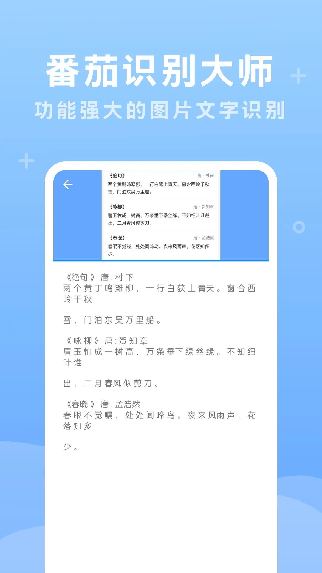 番茄识别大师是一款专业的智能扫描识别应用,为用户提供高效便捷的文字提取解决方案。这款APP采用先进的OCR技术,支持多种扫描模式,无论是拍照还是导入图片,都能快速准确地识别其中的文字内容。其简洁直观的界面设计让操作变得异常简单,识别后的文字可直接编辑使用,大大提升了工作和学习效率。无论是处理文档、整理笔记还是收集资料,番茄识别大师都能成为您的得力助手。