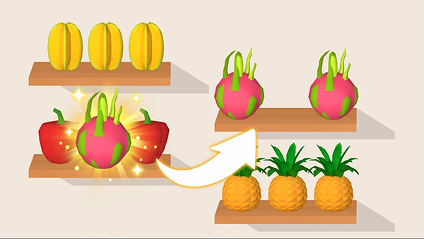 游戏内设有丰富多样的商品种类,从热带水果火龙果到夏季时令荔枝和杨梅,它们被巧妙地摆放在不同区域的货架上。玩家需要运用生活常识,快速识别并匹配同类商品。